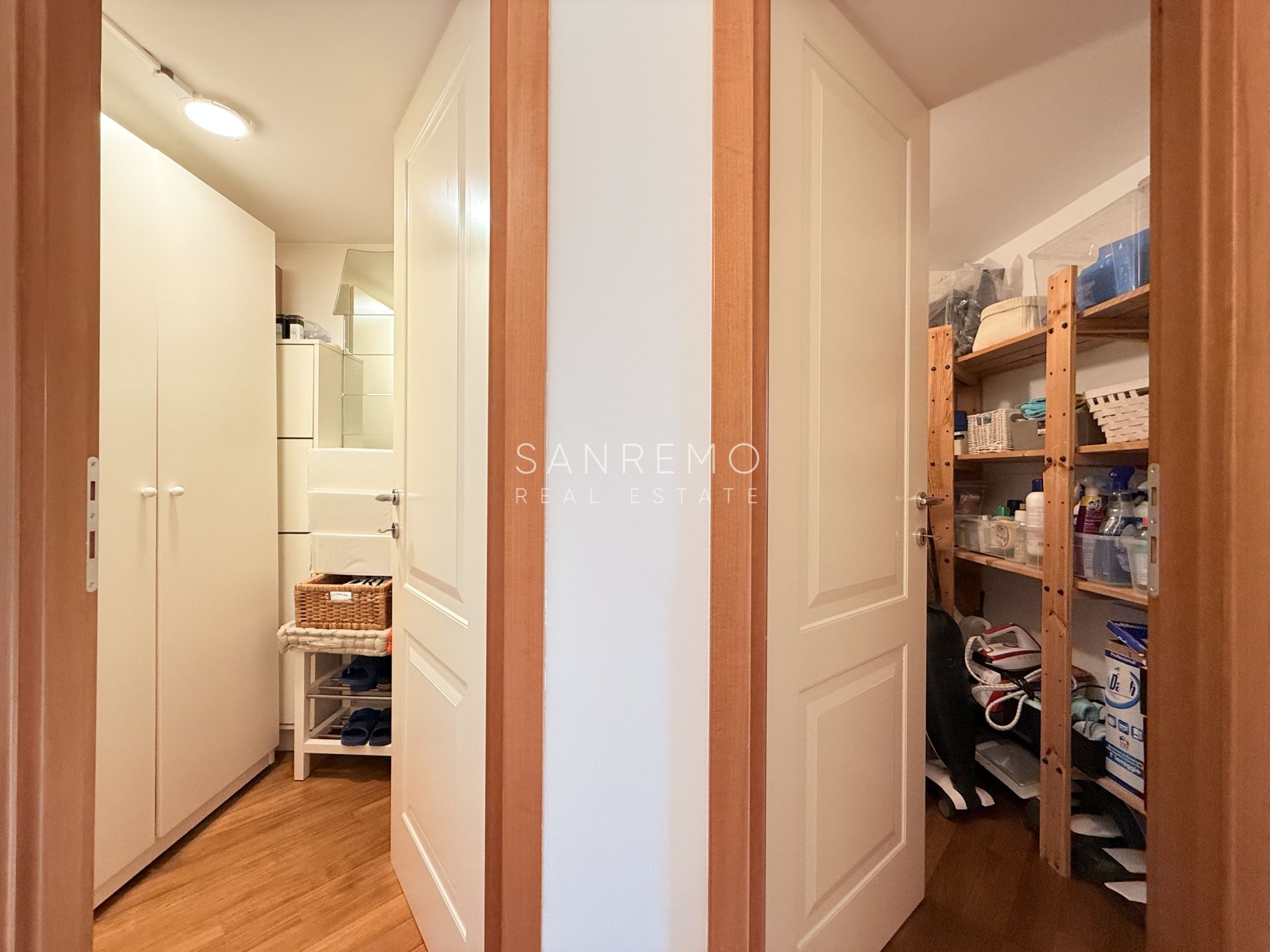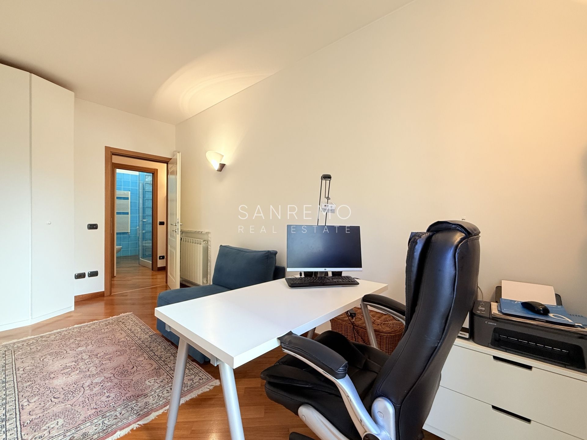 The apartment features a large and welcoming living room, a fully equipped eat-in kitchen, three bedrooms, three bathrooms, two storage rooms, and a practical utility balcony. A private garage and a cellar complete the offer.