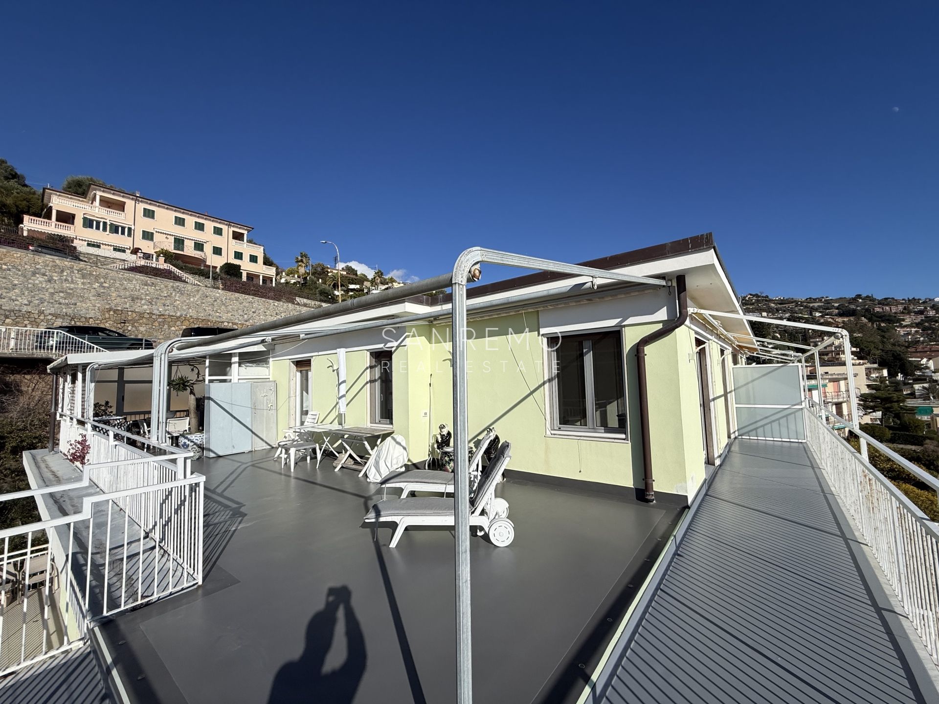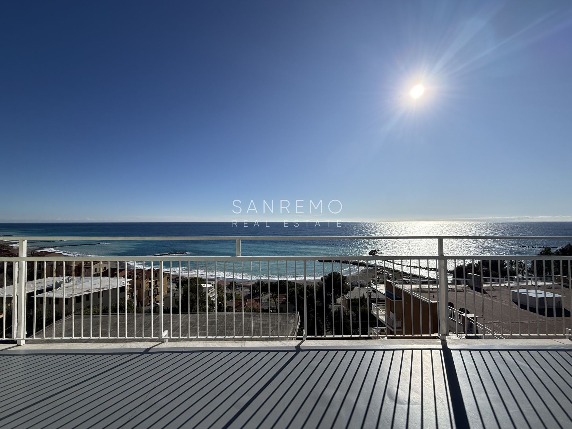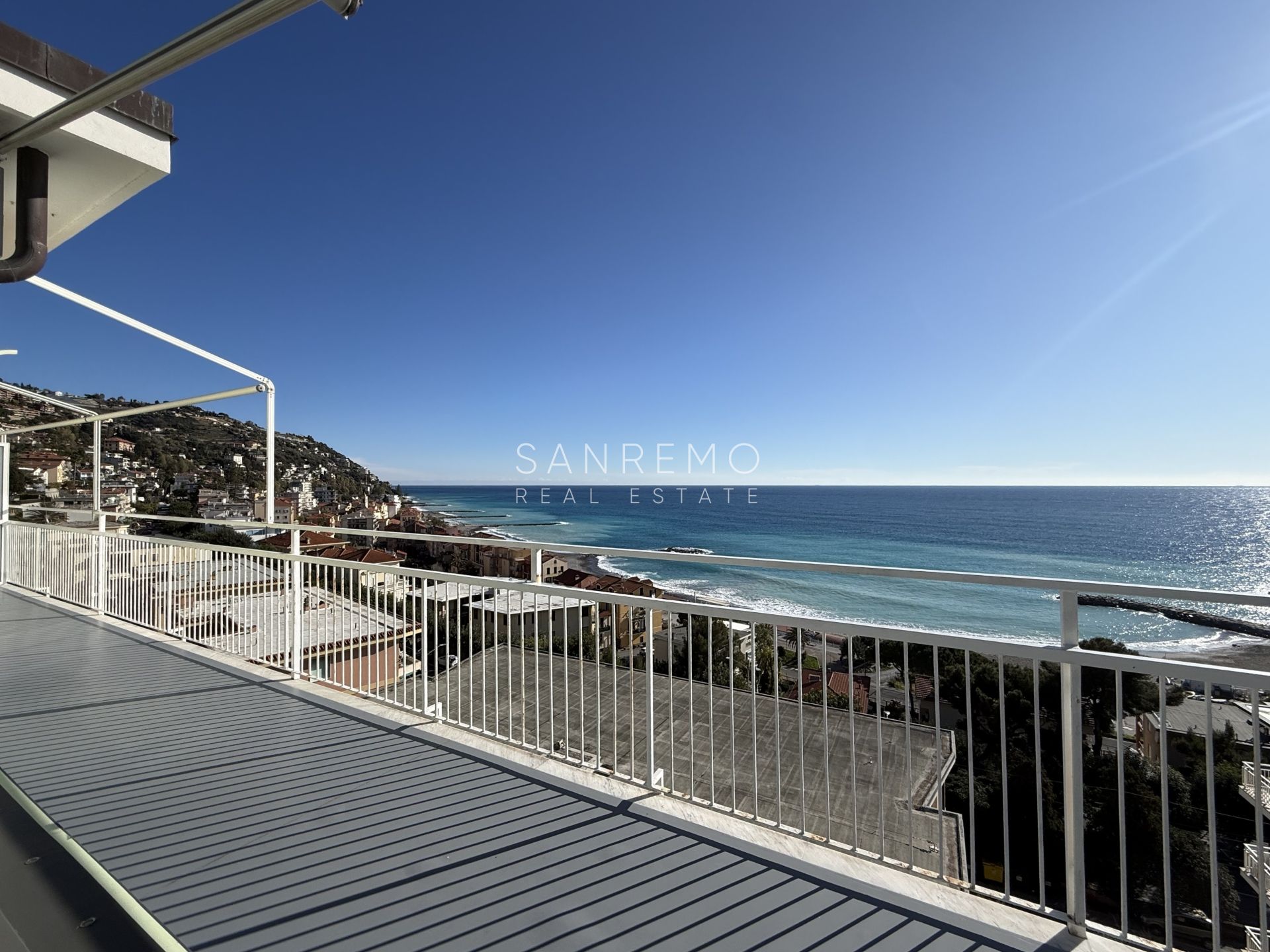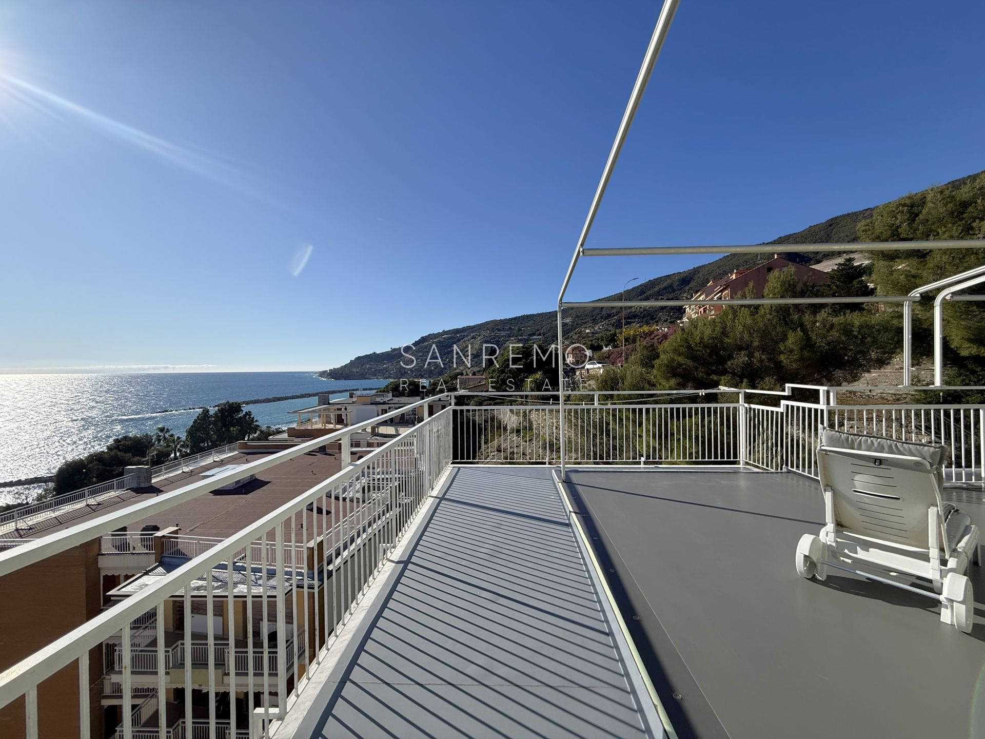 We offer for sale a splendid penthouse located in Ospedaletti, in a dominant and panoramic position, featuring double access: one directly from the coastal cycle path and the other from the main road, making it extremely convenient even for those moving on foot. The apartment, renovated approximately three years ago, is in excellent condition and comprises: a bright living room with kitchenette and direct access to a large sea-view terrace, partially enclosed, ideal for outdoor lunches and dinners sheltered from wind and direct sunlight; three bedrooms, all with access to the terrace, and two bathrooms. The sea view is open and striking, perfect for those seeking an exclusive property in one of the most desirable areas of the Riviera. The property also offers the possibility of purchasing separately a large garage, rare and highly sought-after in the area. An ideal solution as a primary residence, prestigious home or investment. The apartment features independent heating with underfloor system, air conditioning and video intercom.