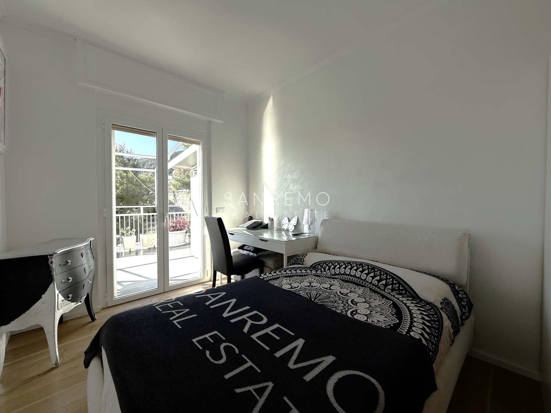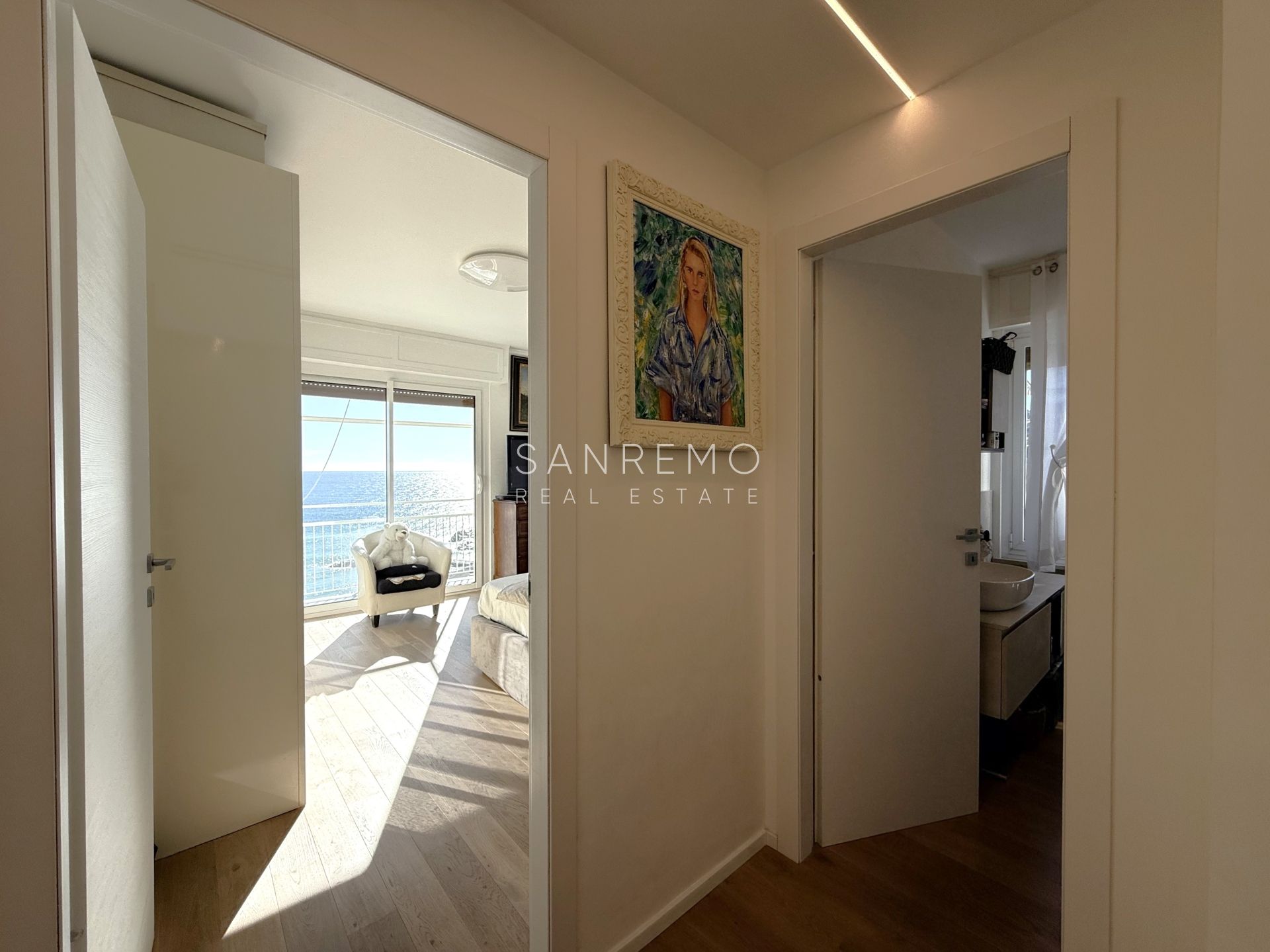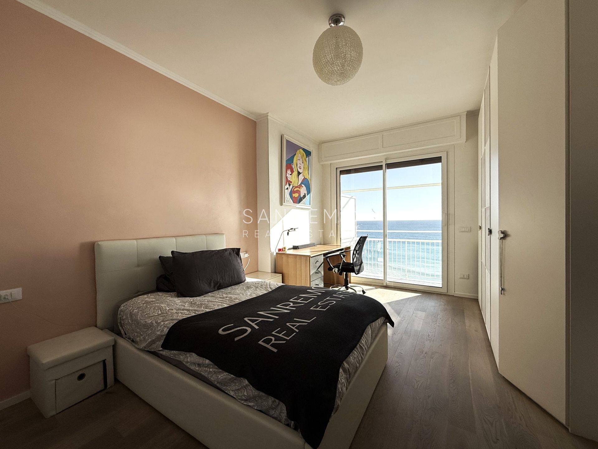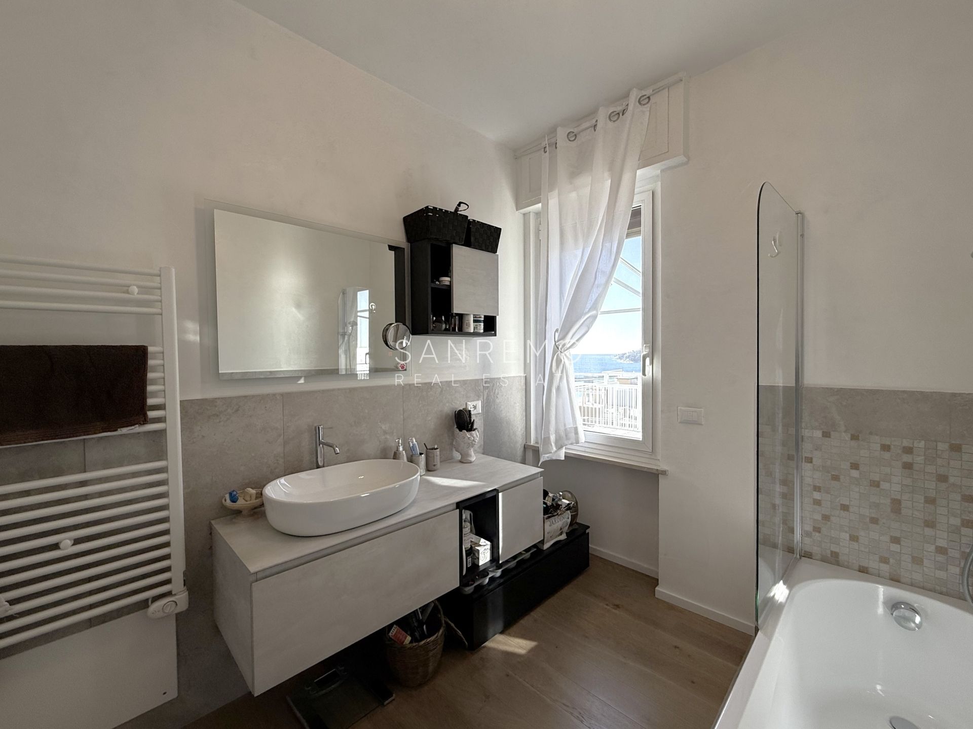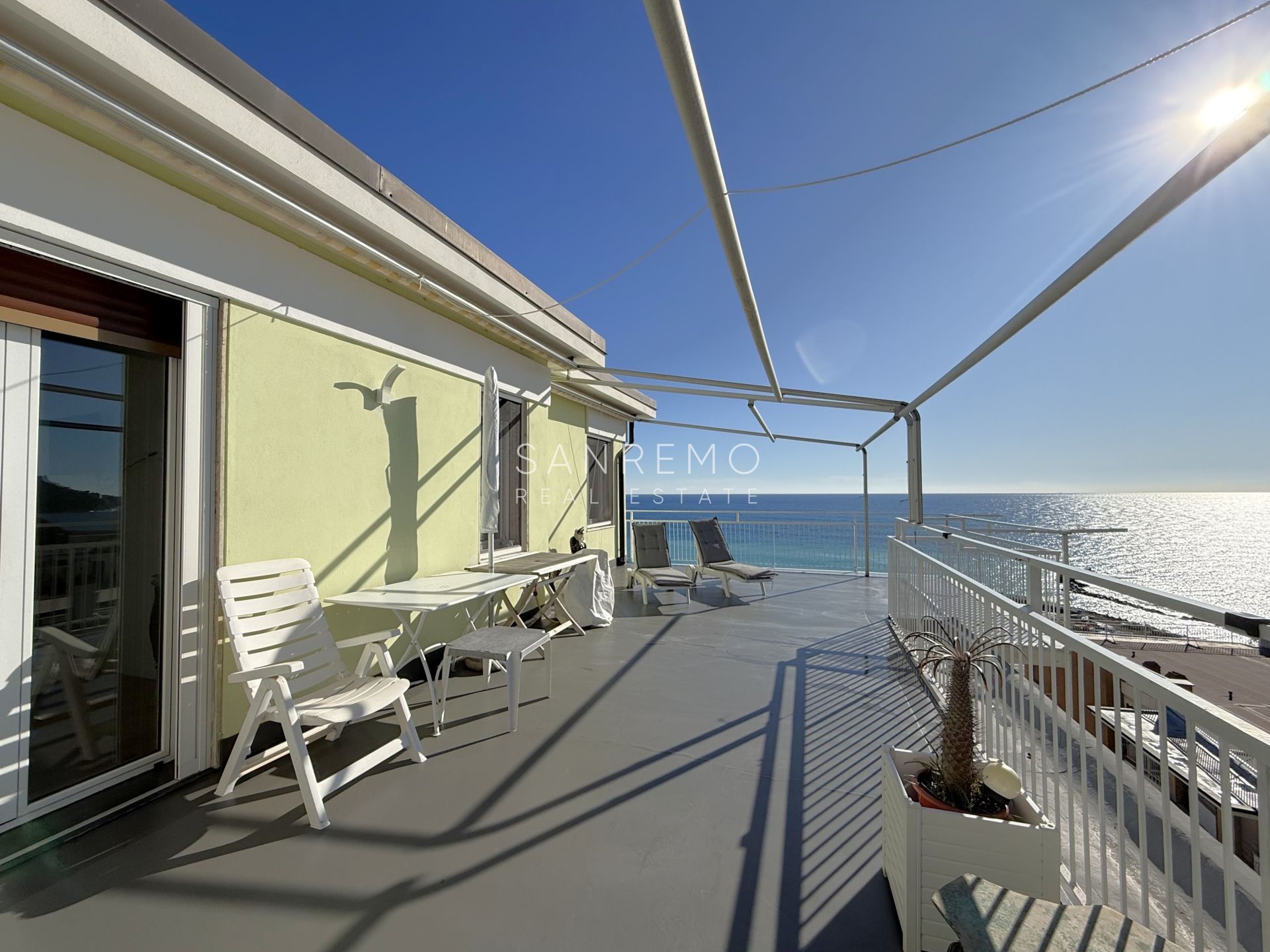 We offer for sale a splendid penthouse located in Ospedaletti, in a dominant and panoramic position, featuring double access: one directly from the coastal cycle path and the other from the main road, making it extremely convenient even for those moving on foot. The apartment, renovated approximately three years ago, is in excellent condition and comprises: a bright living room with kitchenette and direct access to a large sea-view terrace, partially enclosed, ideal for outdoor lunches and dinners sheltered from wind and direct sunlight; three bedrooms, all with access to the terrace, and two bathrooms. The sea view is open and striking, perfect for those seeking an exclusive property in one of the most desirable areas of the Riviera. The property also offers the possibility of purchasing separately a large garage, rare and highly sought-after in the area. An ideal solution as a primary residence, prestigious home or investment. The apartment features independent heating with underfloor system, air conditioning and video intercom.