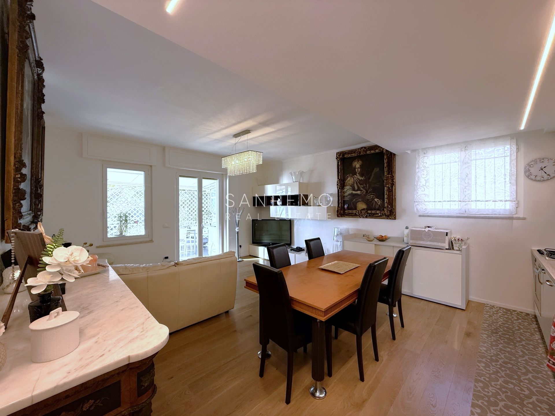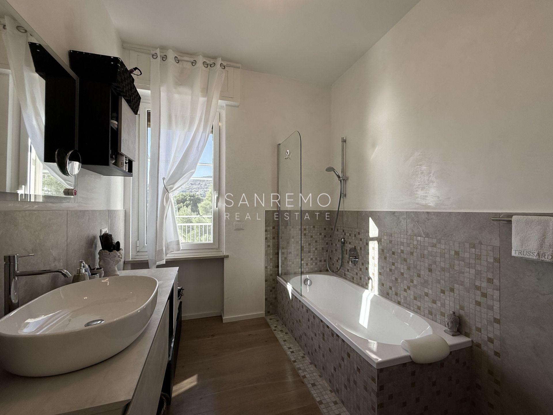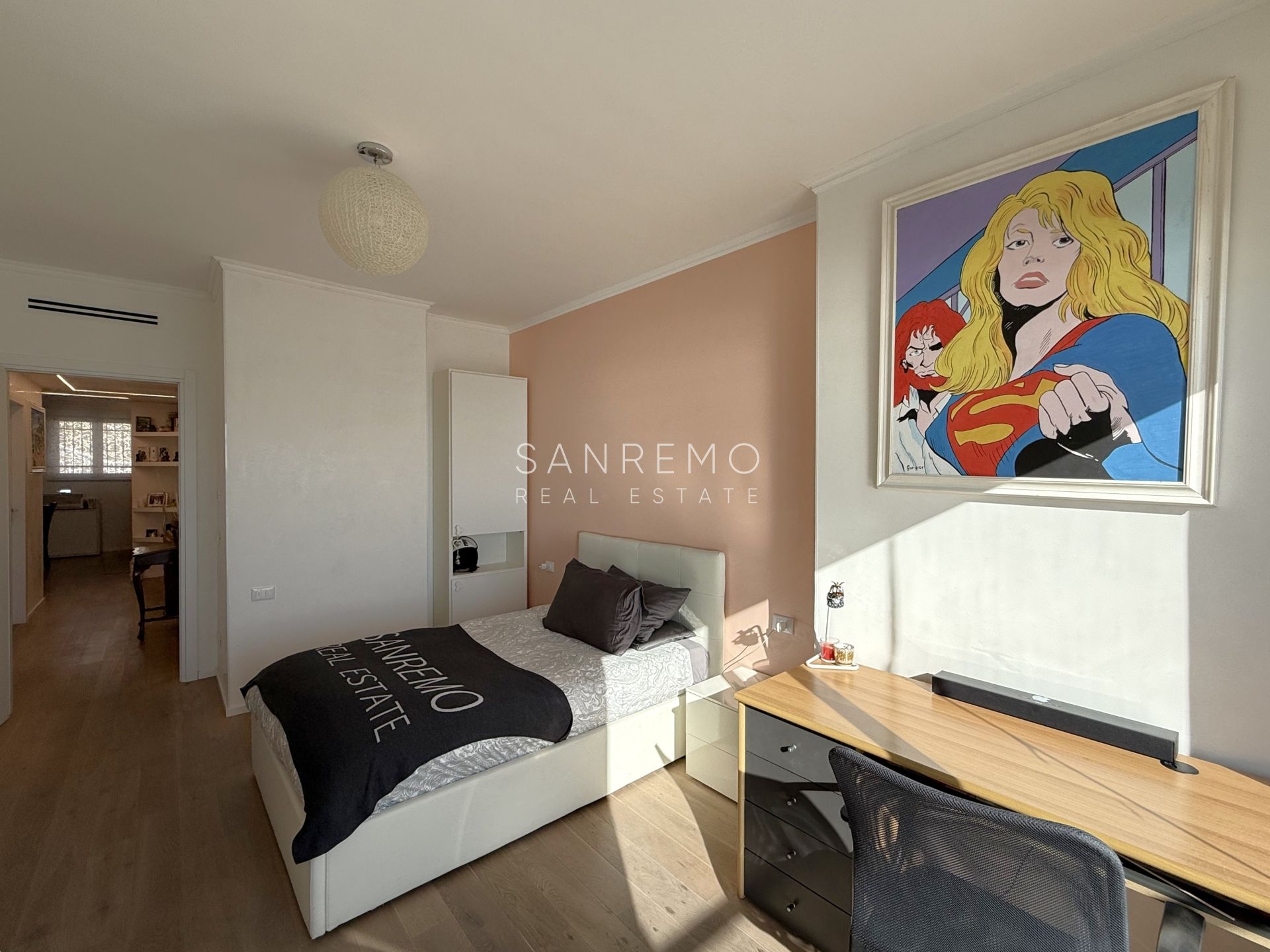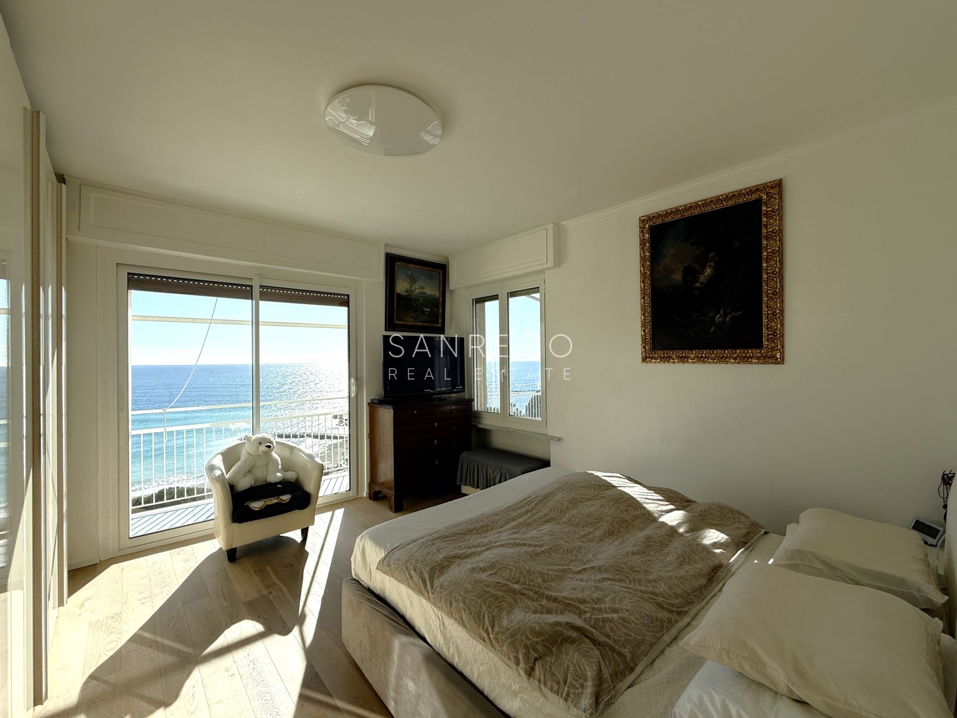 We offer for sale a splendid penthouse located in Ospedaletti, in a dominant and panoramic position, featuring double access: one directly from the coastal cycle path and the other from the main road, making it extremely convenient even for those moving on foot. The apartment, renovated approximately three years ago, is in excellent condition and comprises: a bright living room with kitchenette and direct access to a large sea-view terrace, partially enclosed, ideal for outdoor lunches and dinners sheltered from wind and direct sunlight; three bedrooms, all with access to the terrace, and two bathrooms. The sea view is open and striking, perfect for those seeking an exclusive property in one of the most desirable areas of the Riviera. The property also offers the possibility of purchasing separately a large garage, rare and highly sought-after in the area. An ideal solution as a primary residence, prestigious home or investment. The apartment features independent heating with underfloor system, air conditioning and video intercom.