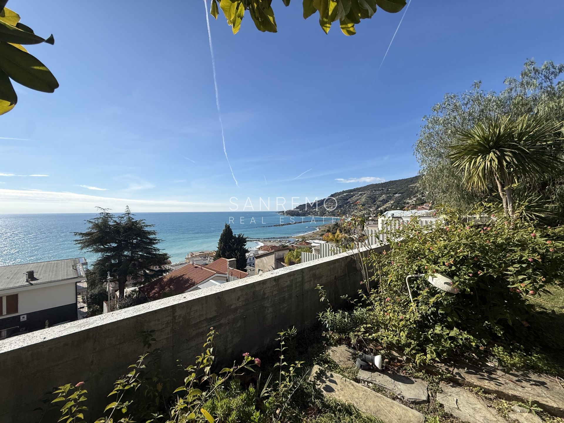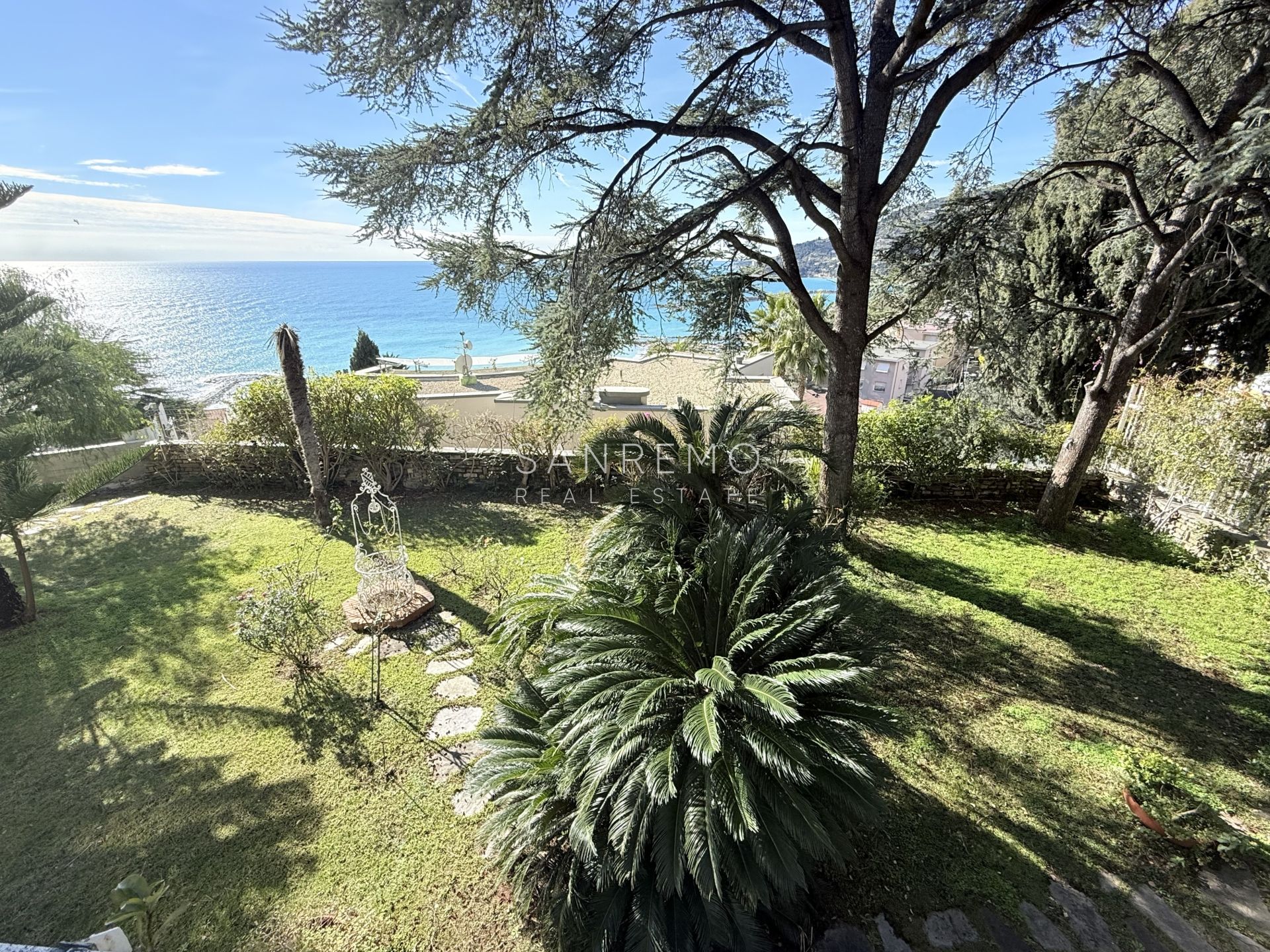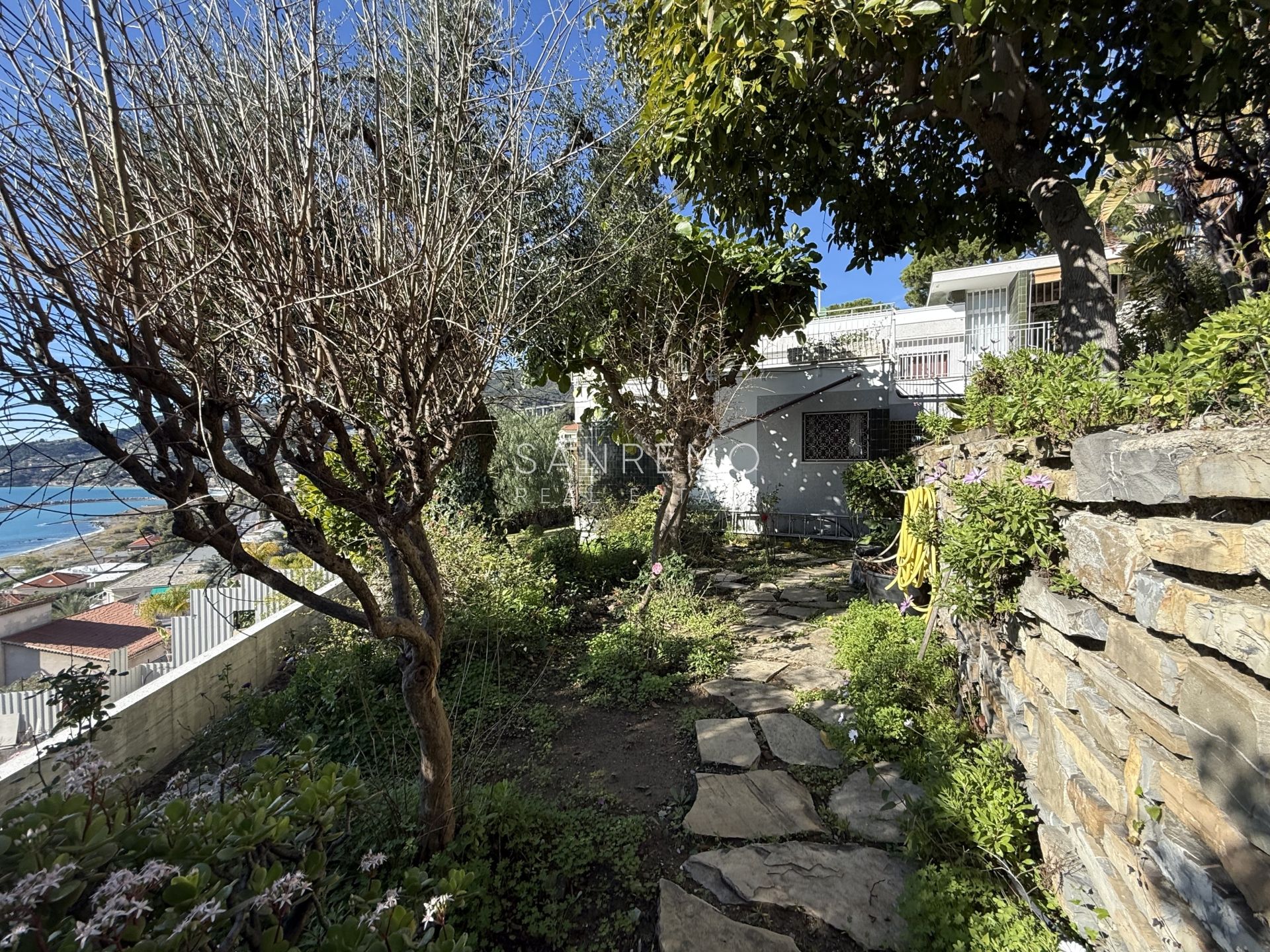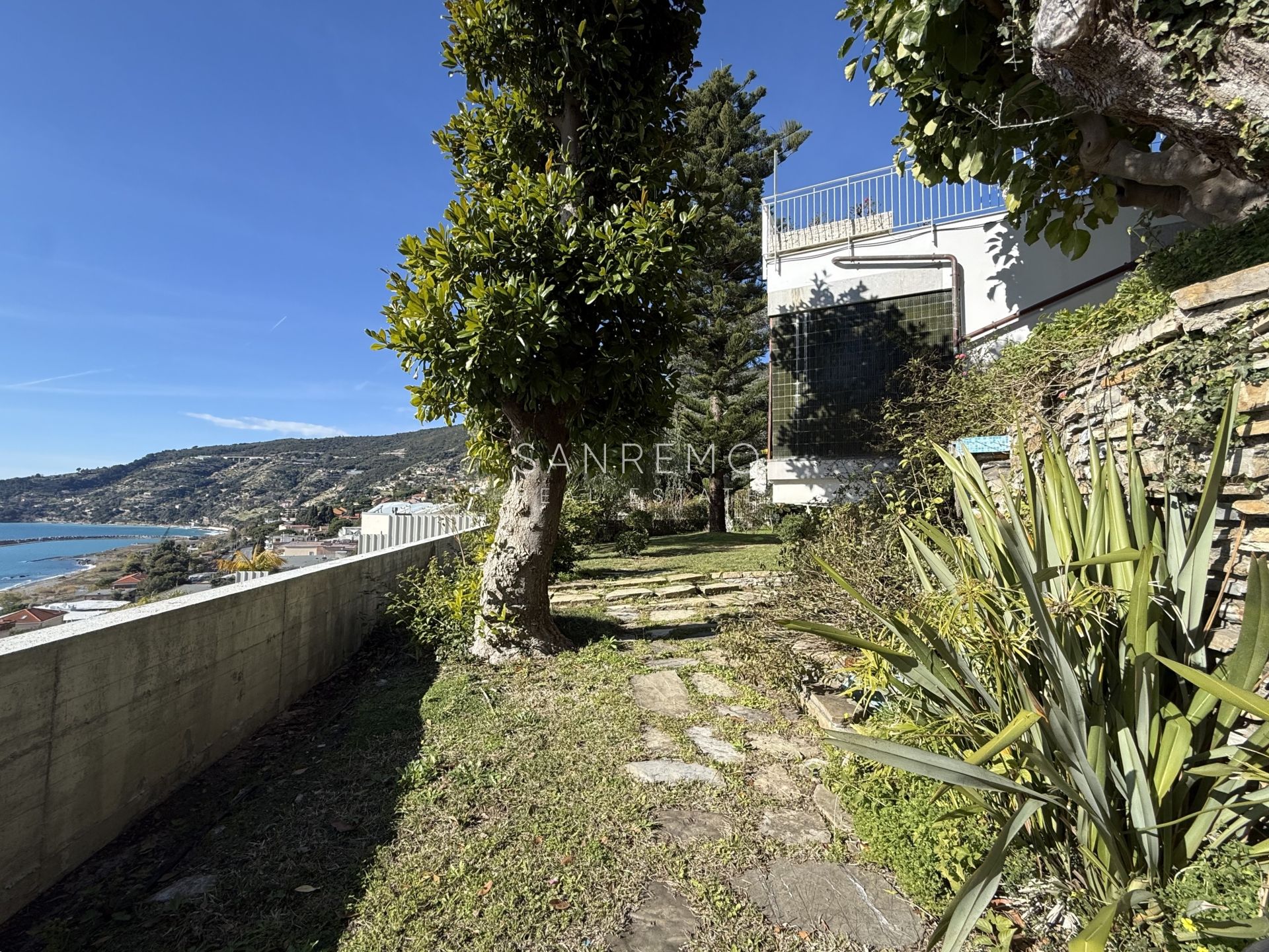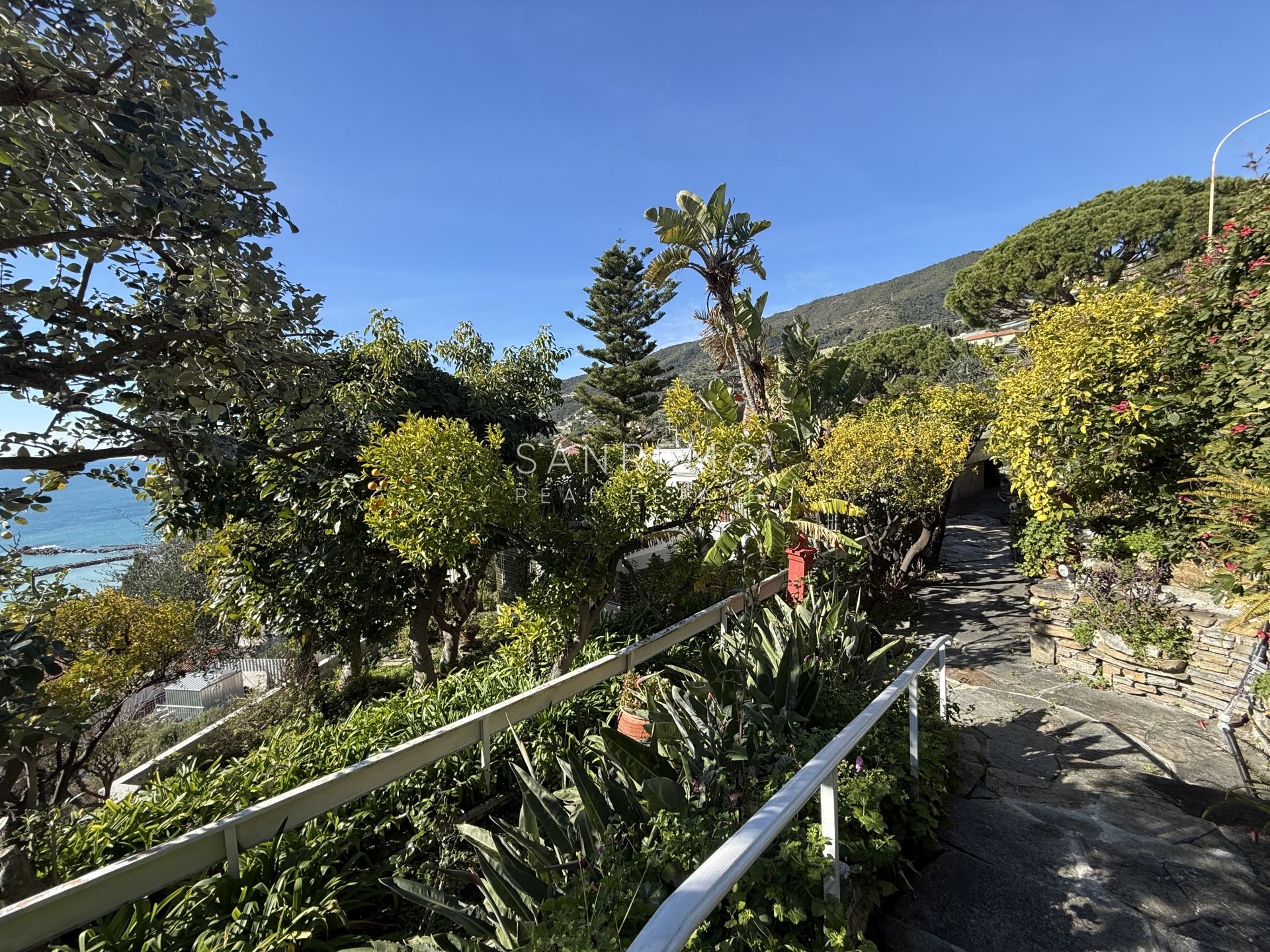 In the heart of refined Ospedaletti, renowned as the Riviera’s mildest climate location, we offer for sale an elegant villa of approximately 340 sqm, set in a context of absolute tranquility and surrounded by an exclusive private garden, enjoying a splendid open sea view. The property is arranged over three levels and welcomes with harmonious, bright, and perfectly distributed interiors. On the upper floor, a representative entrance leads to a spacious living room flooded with natural light, ideal for moments of conviviality and relaxation, alongside a large kitchen with dining area. This level is completed by a refined master bedroom with windowed bathroom, a convenient storage room, and an additional guest bathroom. The sleeping area, accessible via an internal staircase, is designed to ensure maximum privacy and comfort: here you will find two cozy bedrooms and two bathrooms, perfect for hosting family and guests in an intimate and reserved atmosphere. On the garden level, a generous ancillary area unfolds, ideal for customization according to personal needs: a charming tavern, large service rooms, laundry, and multifunctional spaces offer interesting opportunities to create wellness, leisure, or guest areas. The reserved and elevated position provides a sense of complete privacy while remaining perfectly connected: the center of Ospedaletti, its beaches, and the renowned coastal cycle path are easily reachable, allowing you to fully enjoy the authentic charm of the Riviera. A residence that combines elegance, nature, and quality of life, ideal both as a primary home and as an exclusive holiday retreat. The property is completed by a covered parking area for two cars.