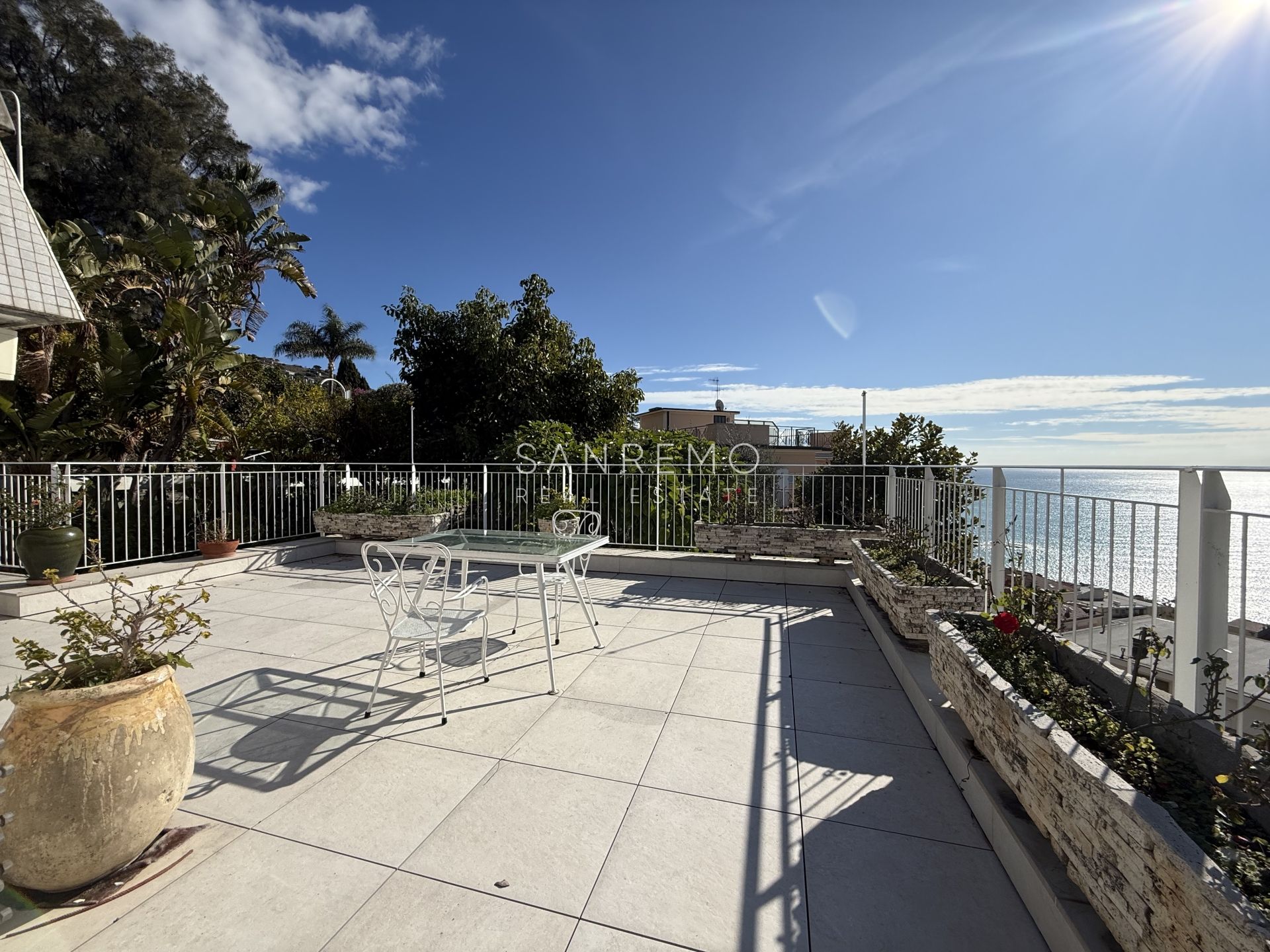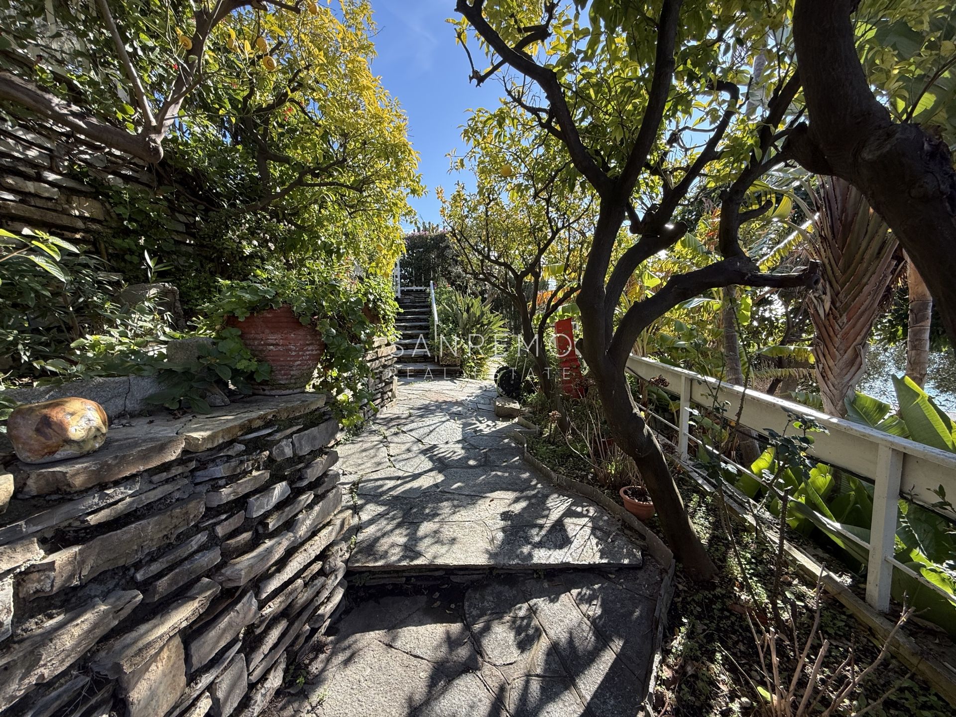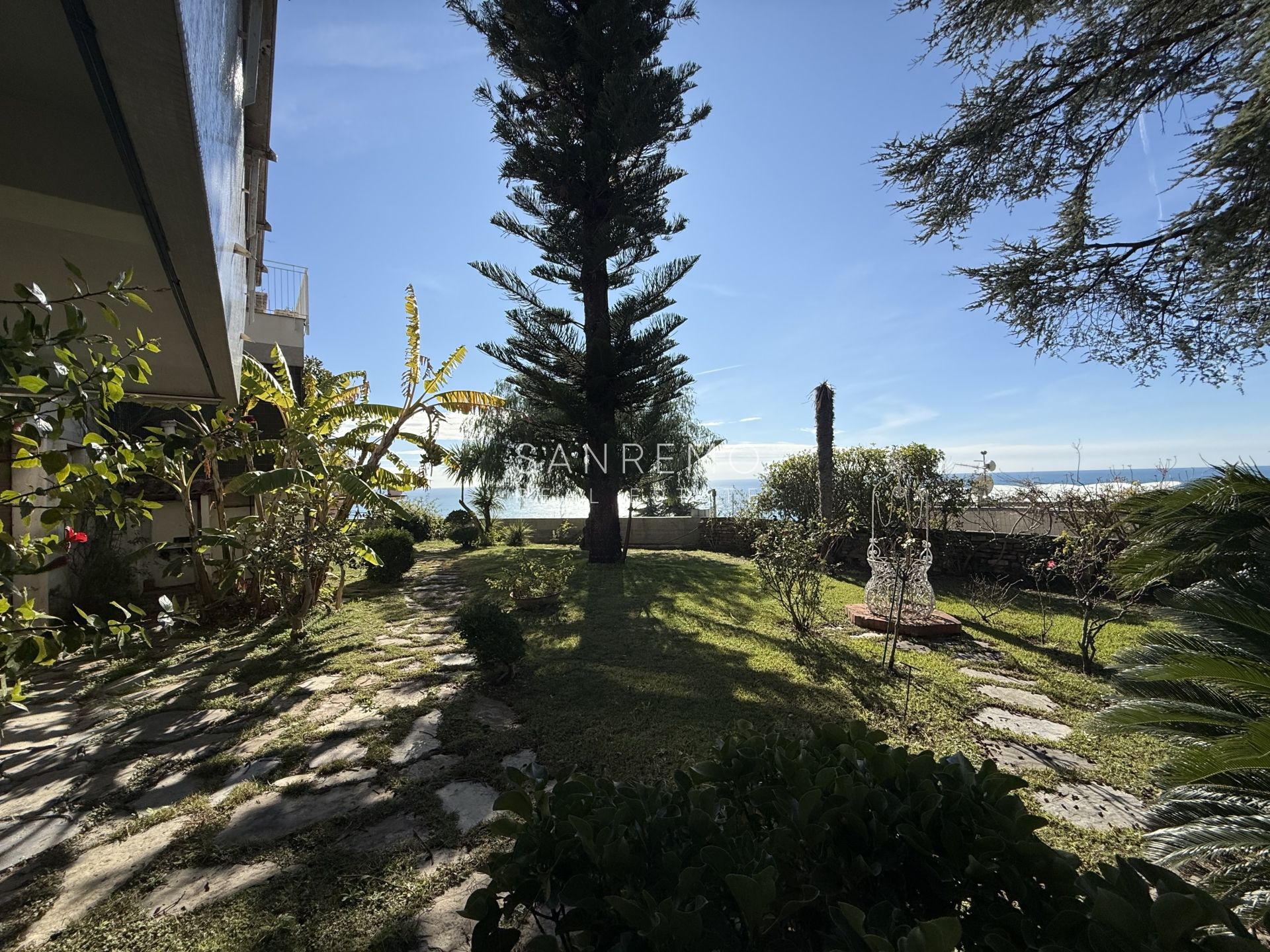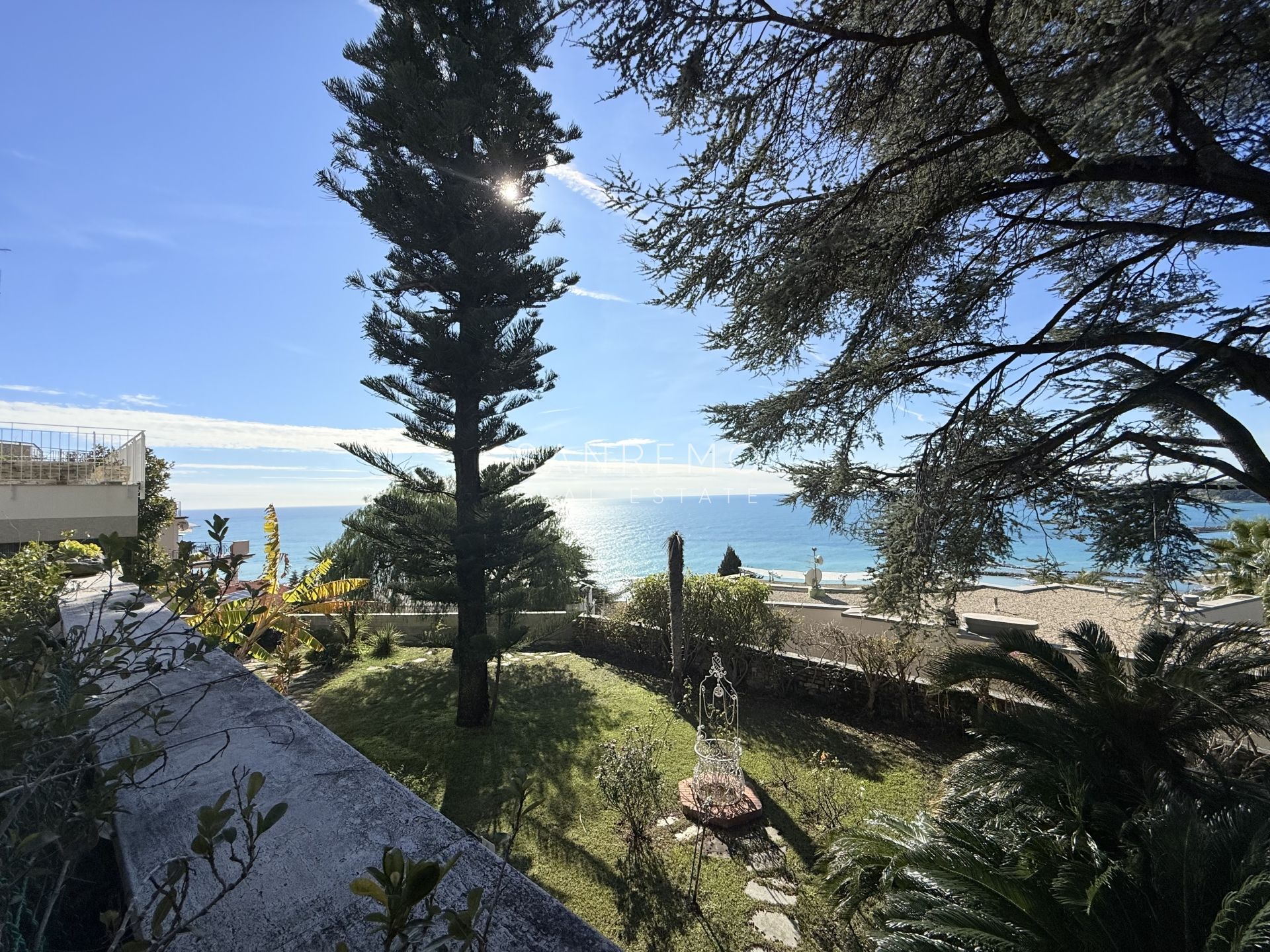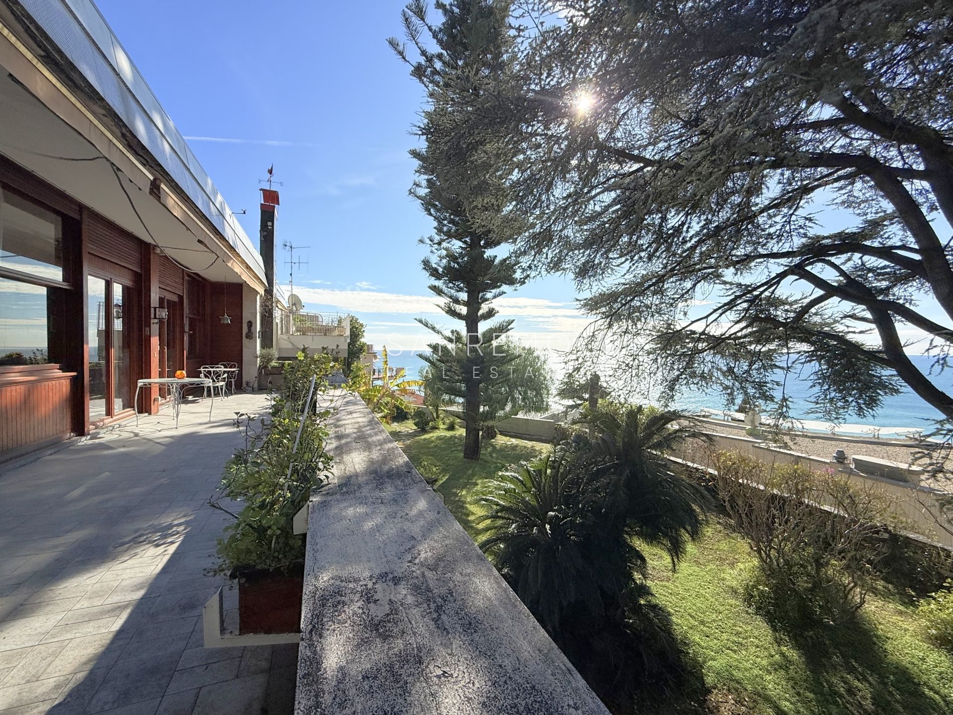 In the heart of refined Ospedaletti, renowned as the Riviera’s mildest climate location, we offer for sale an elegant villa of approximately 340 sqm, set in a context of absolute tranquility and surrounded by an exclusive private garden, enjoying a splendid open sea view. The property is arranged over three levels and welcomes with harmonious, bright, and perfectly distributed interiors. On the upper floor, a representative entrance leads to a spacious living room flooded with natural light, ideal for moments of conviviality and relaxation, alongside a large kitchen with dining area. This level is completed by a refined master bedroom with windowed bathroom, a convenient storage room, and an additional guest bathroom. The sleeping area, accessible via an internal staircase, is designed to ensure maximum privacy and comfort: here you will find two cozy bedrooms and two bathrooms, perfect for hosting family and guests in an intimate and reserved atmosphere. On the garden level, a generous ancillary area unfolds, ideal for customization according to personal needs: a charming tavern, large service rooms, laundry, and multifunctional spaces offer interesting opportunities to create wellness, leisure, or guest areas. The reserved and elevated position provides a sense of complete privacy while remaining perfectly connected: the center of Ospedaletti, its beaches, and the renowned coastal cycle path are easily reachable, allowing you to fully enjoy the authentic charm of the Riviera. A residence that combines elegance, nature, and quality of life, ideal both as a primary home and as an exclusive holiday retreat. The property is completed by a covered parking area for two cars.