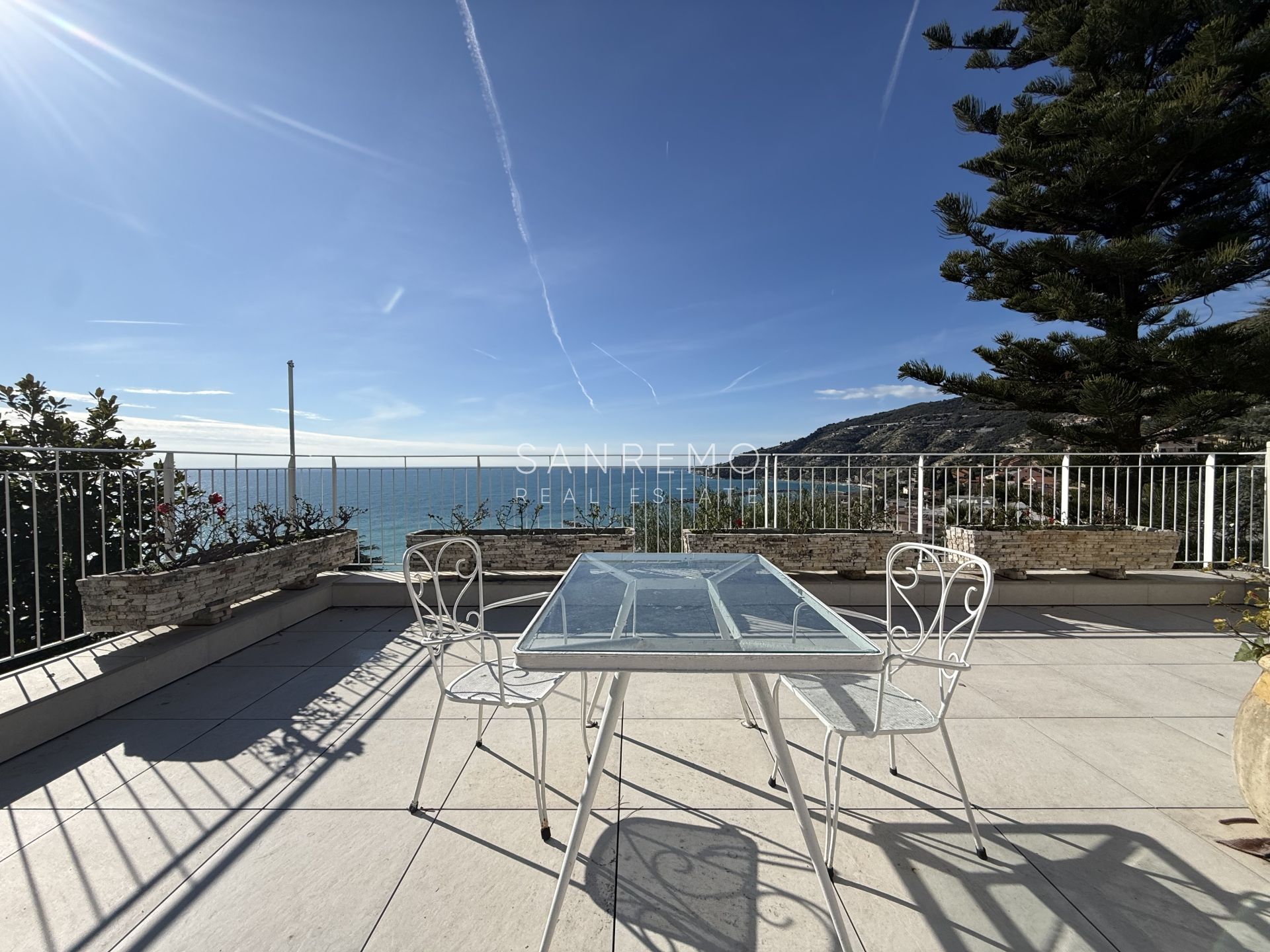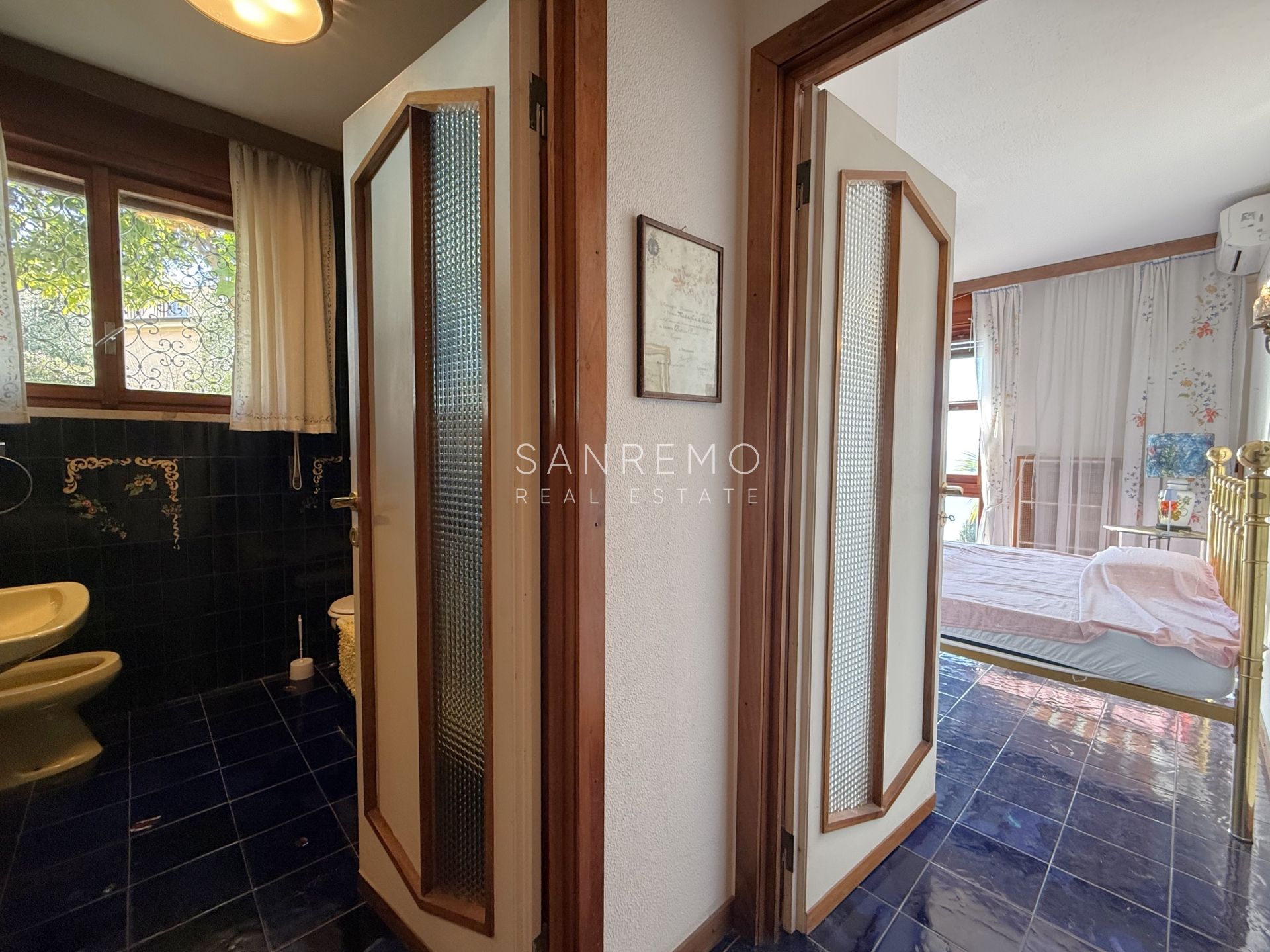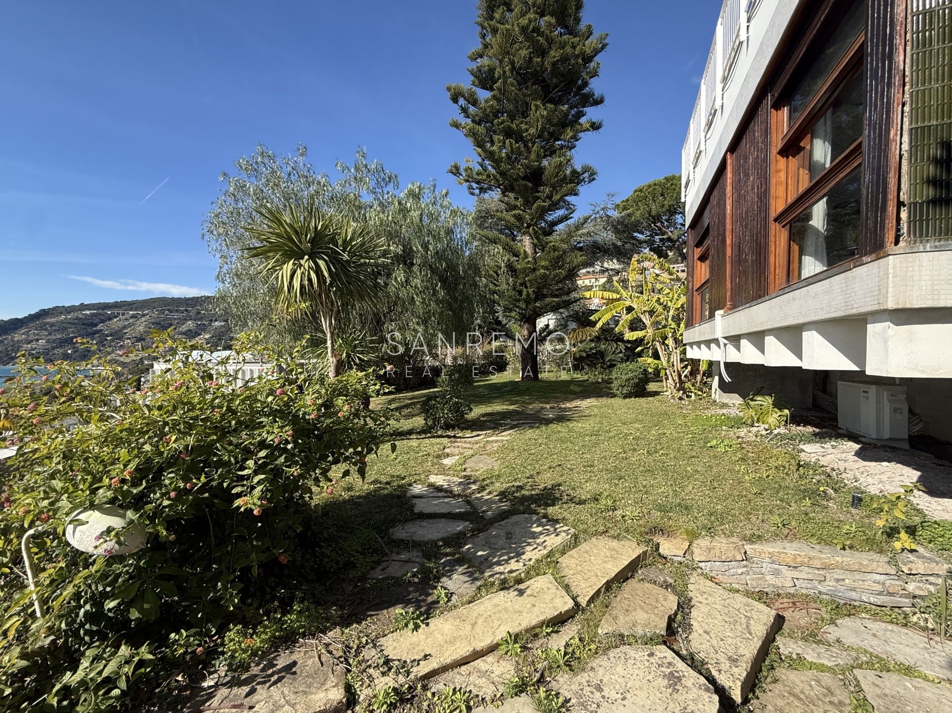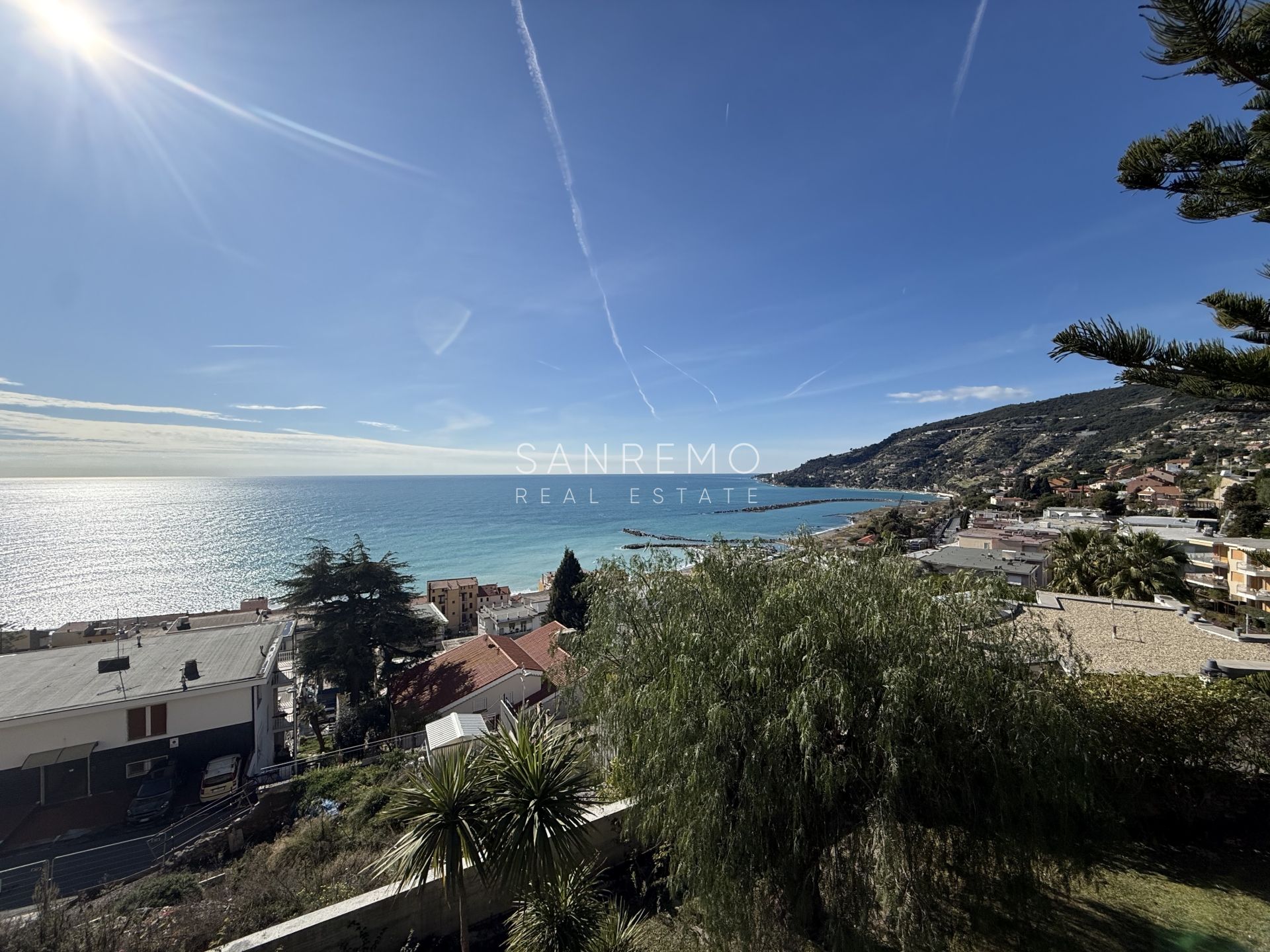 In the heart of refined Ospedaletti, renowned as the Riviera’s mildest climate location, we offer for sale an elegant villa of approximately 340 sqm, set in a context of absolute tranquility and surrounded by an exclusive private garden, enjoying a splendid open sea view. The property is arranged over three levels and welcomes with harmonious, bright, and perfectly distributed interiors. On the upper floor, a representative entrance leads to a spacious living room flooded with natural light, ideal for moments of conviviality and relaxation, alongside a large kitchen with dining area. This level is completed by a refined master bedroom with windowed bathroom, a convenient storage room, and an additional guest bathroom. The sleeping area, accessible via an internal staircase, is designed to ensure maximum privacy and comfort: here you will find two cozy bedrooms and two bathrooms, perfect for hosting family and guests in an intimate and reserved atmosphere. On the garden level, a generous ancillary area unfolds, ideal for customization according to personal needs: a charming tavern, large service rooms, laundry, and multifunctional spaces offer interesting opportunities to create wellness, leisure, or guest areas. The reserved and elevated position provides a sense of complete privacy while remaining perfectly connected: the center of Ospedaletti, its beaches, and the renowned coastal cycle path are easily reachable, allowing you to fully enjoy the authentic charm of the Riviera. A residence that combines elegance, nature, and quality of life, ideal both as a primary home and as an exclusive holiday retreat. The property is completed by a covered parking area for two cars.